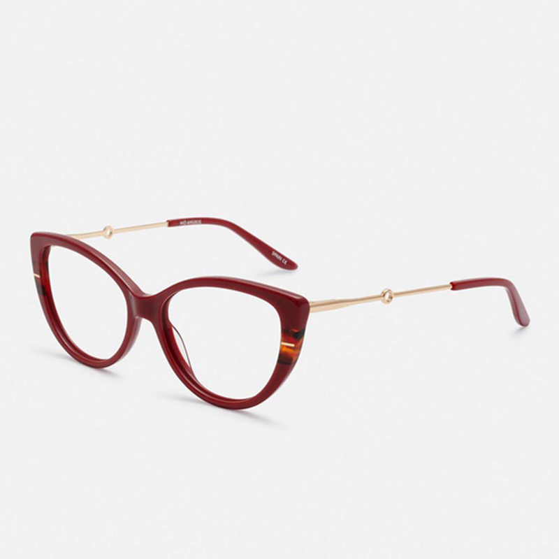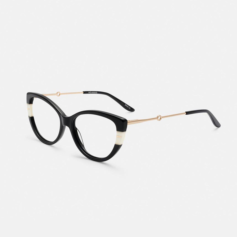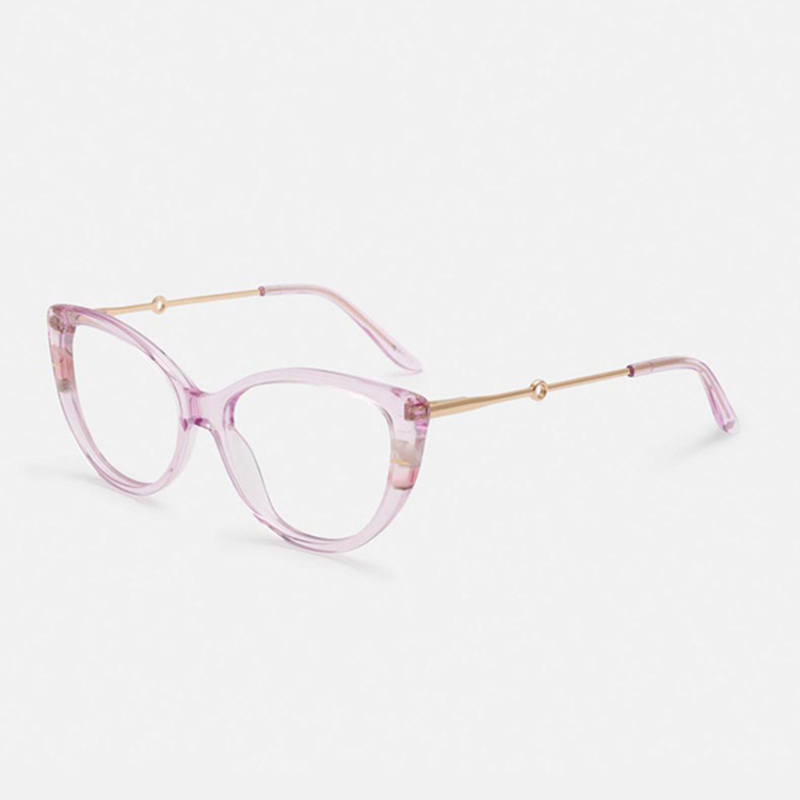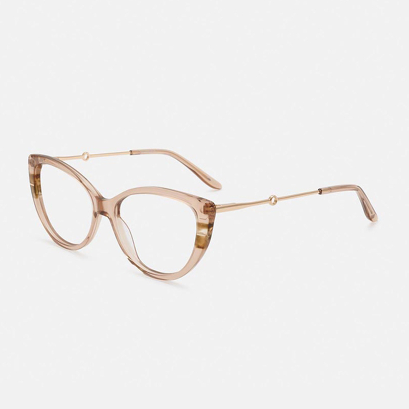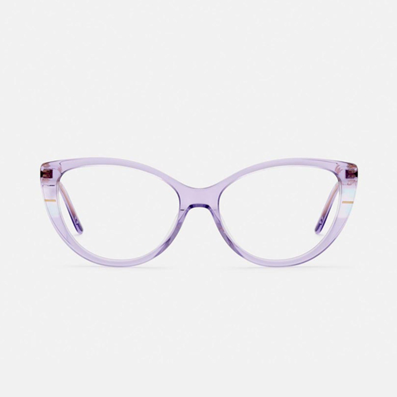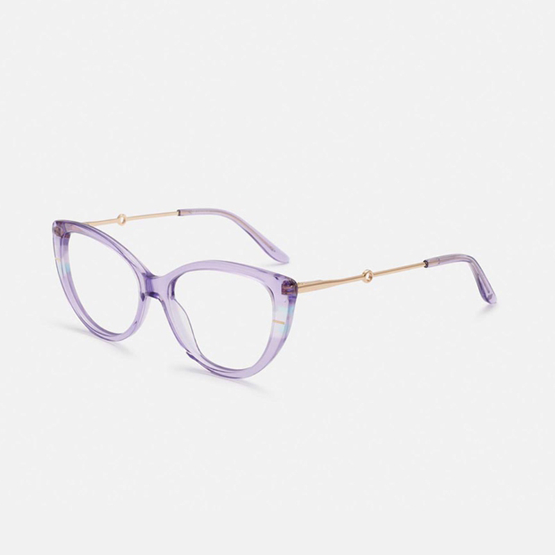 Women’s cat-eye style glasses in transparent pink acetate with veined contrasts. It includes a small hole in the golden metal temples to hold your MÓ laces, giving it a more practical and sophisticated touch.