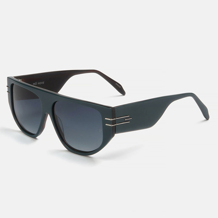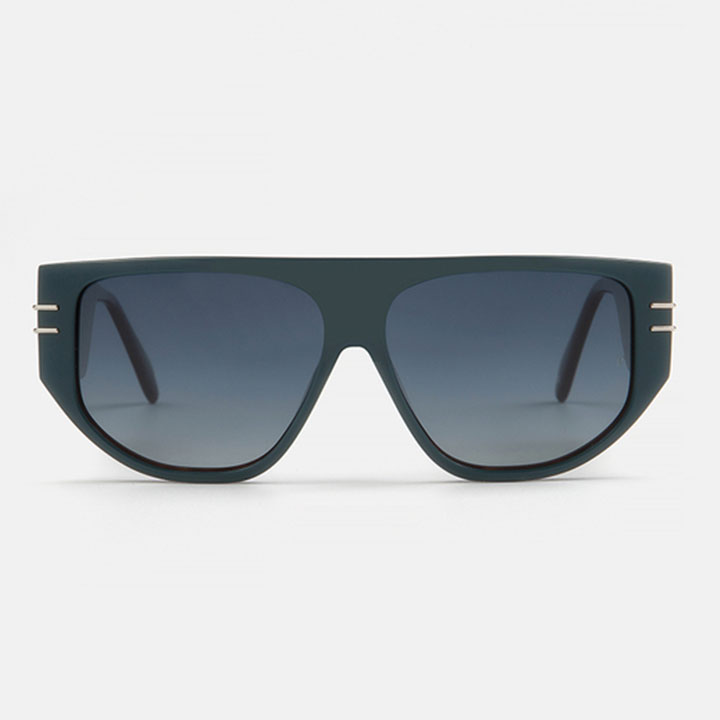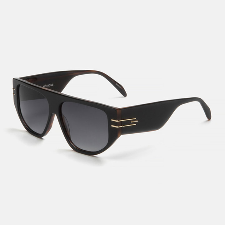 Unisex sunglasses, in the shape of a retro shade, in black acetate, with embossed metallic details that elevate the glasses and give them personality. With gradient lens for a more sophisticated look. Its polarized lenses provide better vision for a more sophisticated look. Its polarized lenses provide sharper vision and better contrast.