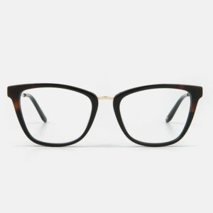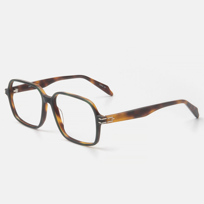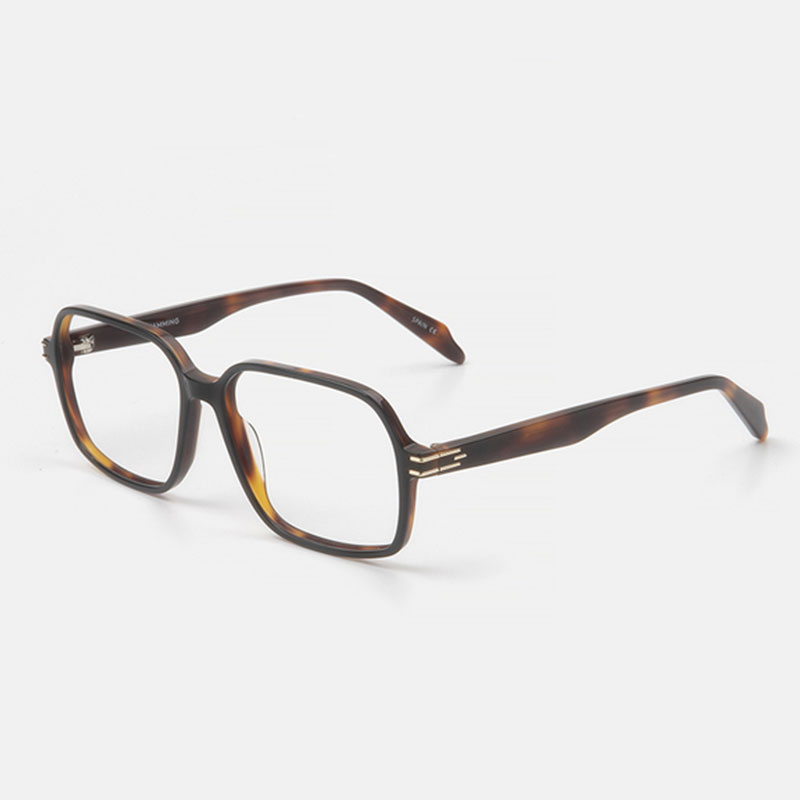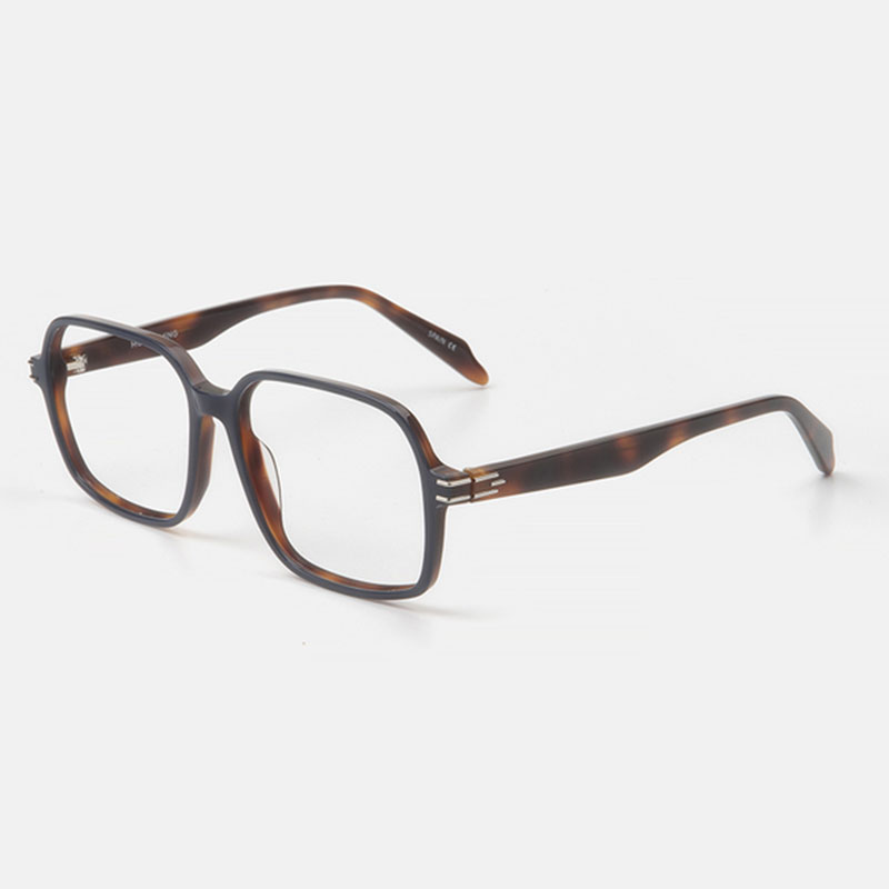 Unisex glasses, with an oversize square shape, in dark tortoiseshell acetate with contrasts on the sides and light tortoiseshell temples. The metallic relief on the temple stands out, raising the glasses and giving the frame personality.