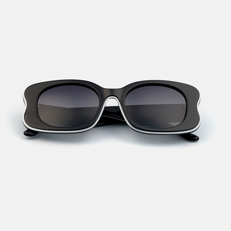 Sunglasses with a “butterfly” silhouette, in black acetate reduced to its second layer in white. Its polarized lenses provide sharper vision and better contrast.