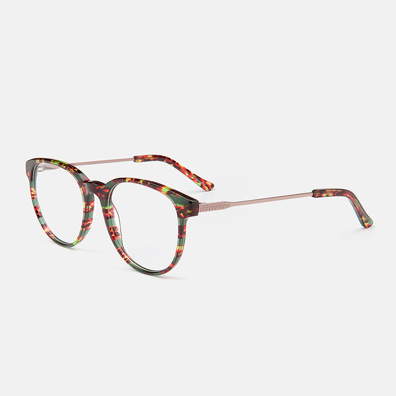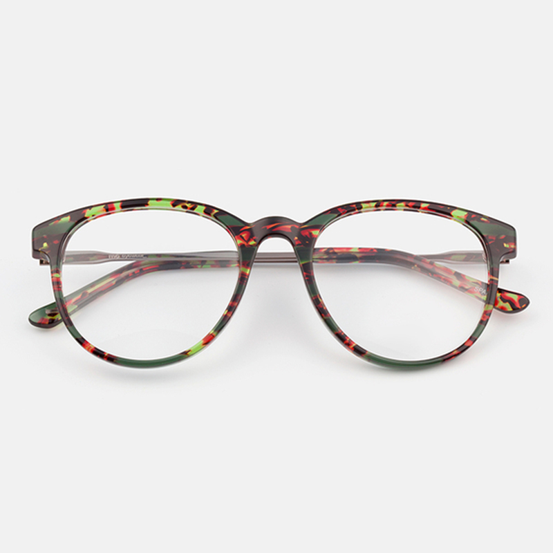 Rounded unisex glasses, the front made of Havana, red and black colored acetate; and silver-colored metal rods.